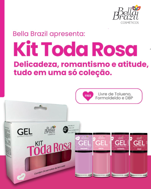 A Bella Brazil apresenta o Kit Rosa Efeito Gel Free, um conjunto de 4 esmaltes em tons rosados que vão do suave ao marcante. Perfeito para quem busca unhas femininas, sofisticadas e versáteis, com brilho intenso, alta cobertura e longa durabilidade — tudo isso sem precisar de cabine UV.
